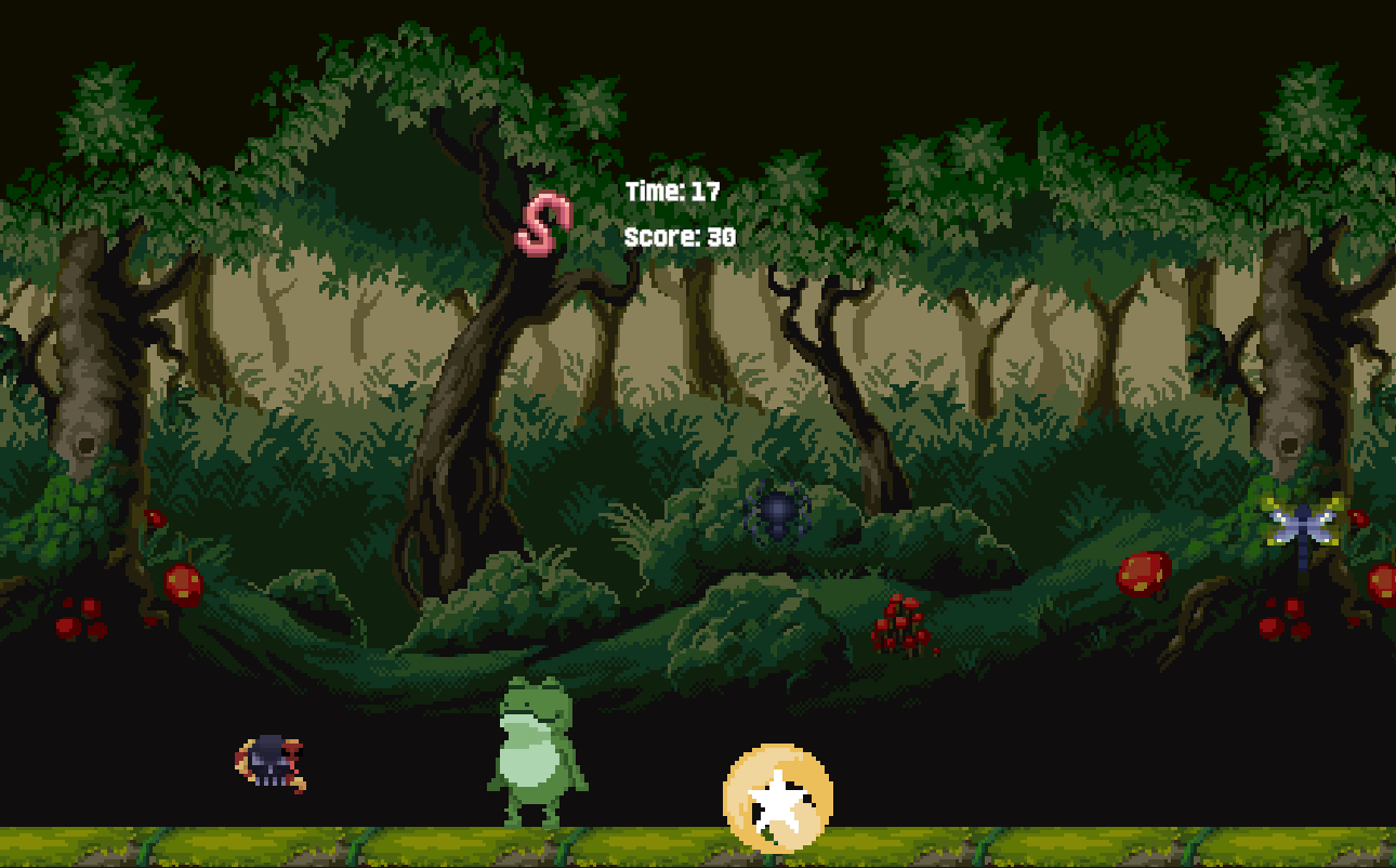 Froggy Catch! is a charming and fast-paced 2D arcade game where you play as a hungry little frog with a big appetite for bugs. Catch as many insects as you can before the timer runs out — but watch out! Not everything that falls from the sky is edible…